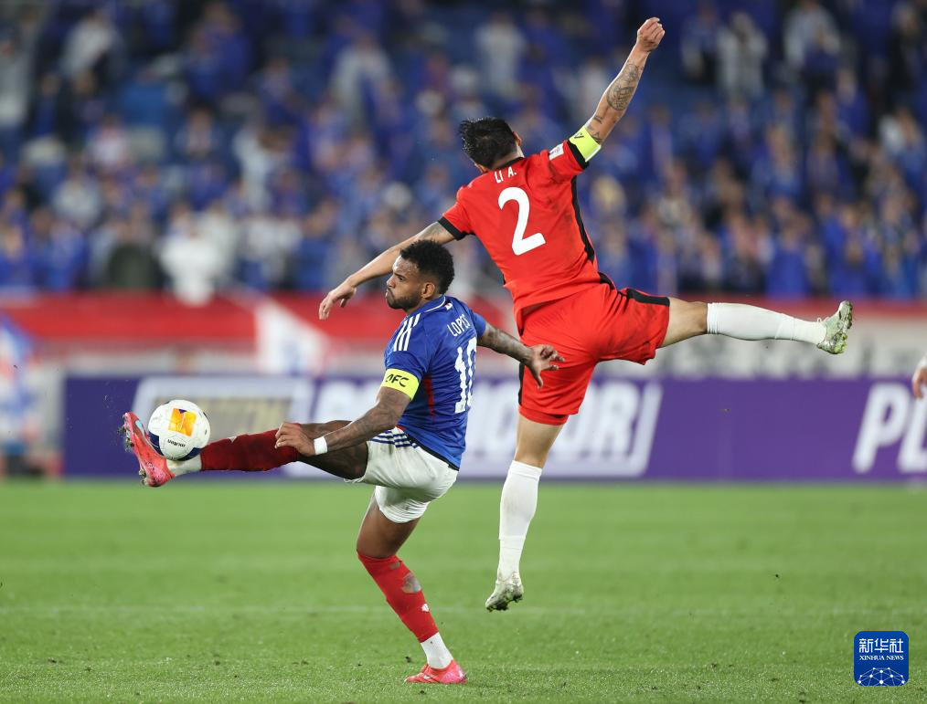 3月11日,横滨水手队球员洛佩斯(左)与上海海港队球员李昂拼抢。