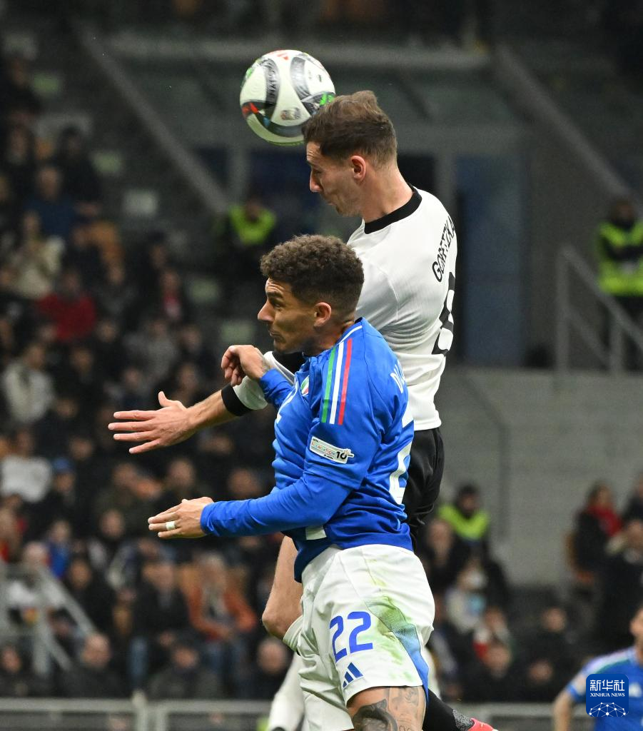 3月20日,意大利队球员迪洛伦佐(左)与德国队球员格雷茨卡在比赛中争顶。