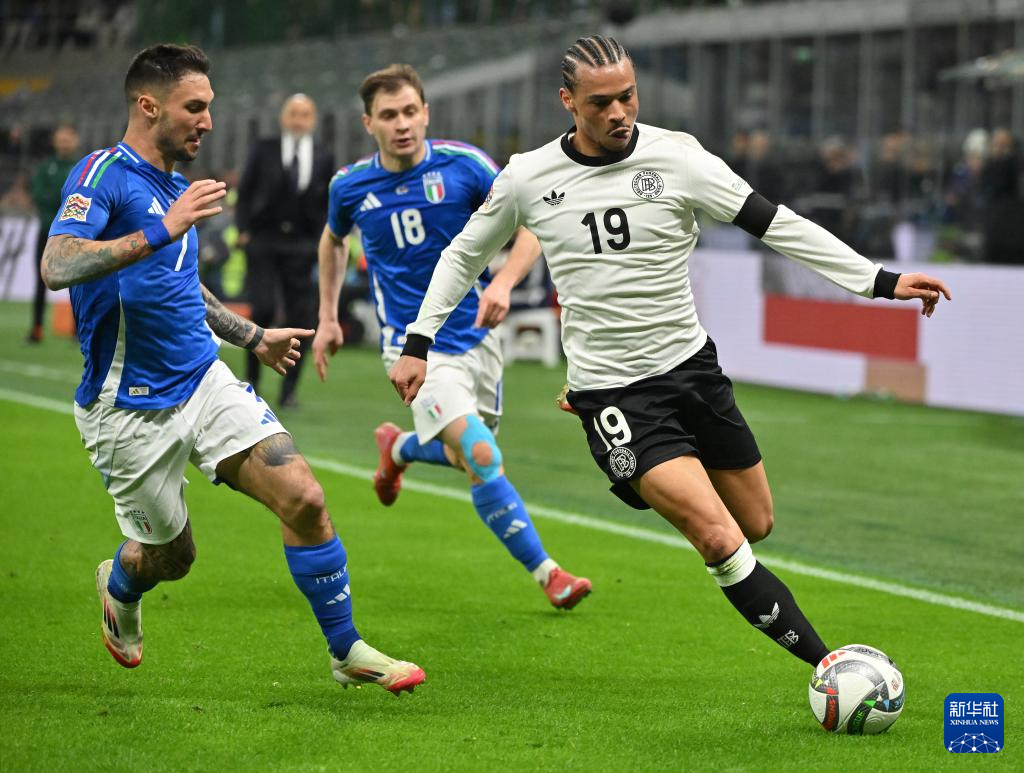 3月20日,意大利队球员波利塔诺(左)与德国队球员萨内(右)在比赛中拼抢。
