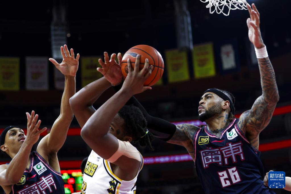 3月24日,广东东阳光队球员莫兰德(下)在比赛中拼抢。