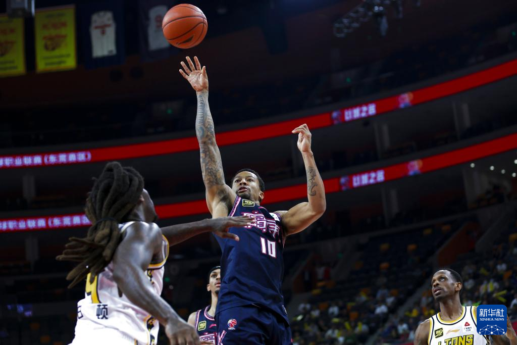 3月24日,广东东阳光队球员伯克(上)在比赛中投篮。