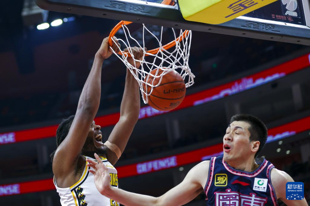 3月24日,浙江方兴渡队球员卡尔顿(左)在比赛中扣篮。
