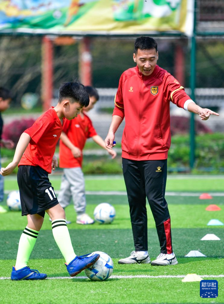 董永恒(中)为榕江县的孩子进行足球基本功培训(3月23日摄)。新华社记者 杨文斌 摄