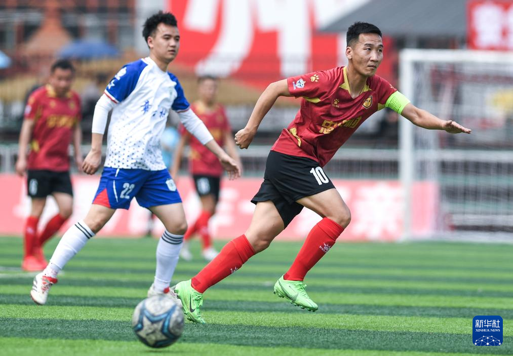 董永恒(右)在2025年贵州“村超”40强交叉赛忠诚村队与章鲁村队的比赛中(3月23日摄)。新华社记者 杨文斌 摄