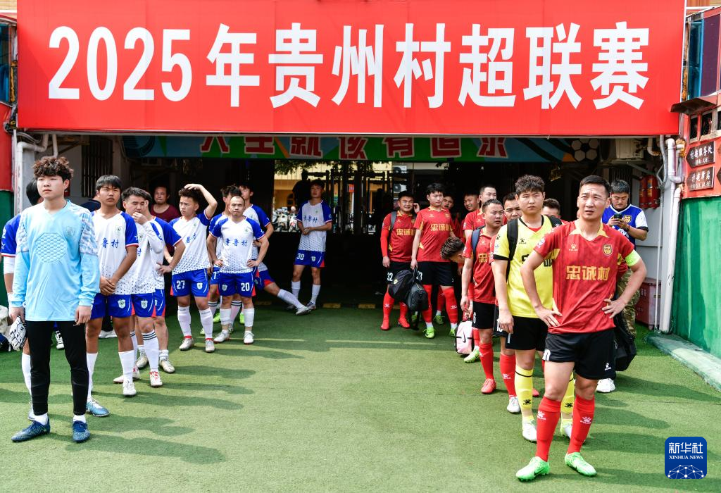 在2025年贵州“村超”40强交叉赛忠诚村队与章鲁村队的比赛开赛前,董永恒(右排前一)与队友们准备入场(3月23日摄)。新华社记者 杨文斌 摄