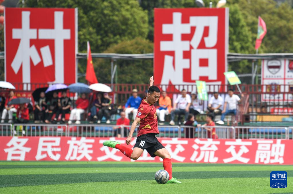 董永恒在2025年贵州“村超”40强交叉赛忠诚村队与章鲁村队的比赛中发定位球(3月23日摄)。新华社记者 杨文斌 摄