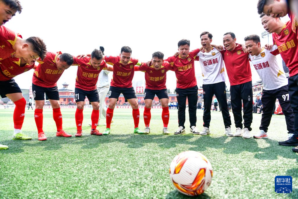 董永恒(左五)与队友们在2025年贵州“村超”40强交叉赛忠诚村队与章鲁村队的比赛开赛前相互加油鼓劲(3月23日摄)。新华社记者 杨文斌 摄
