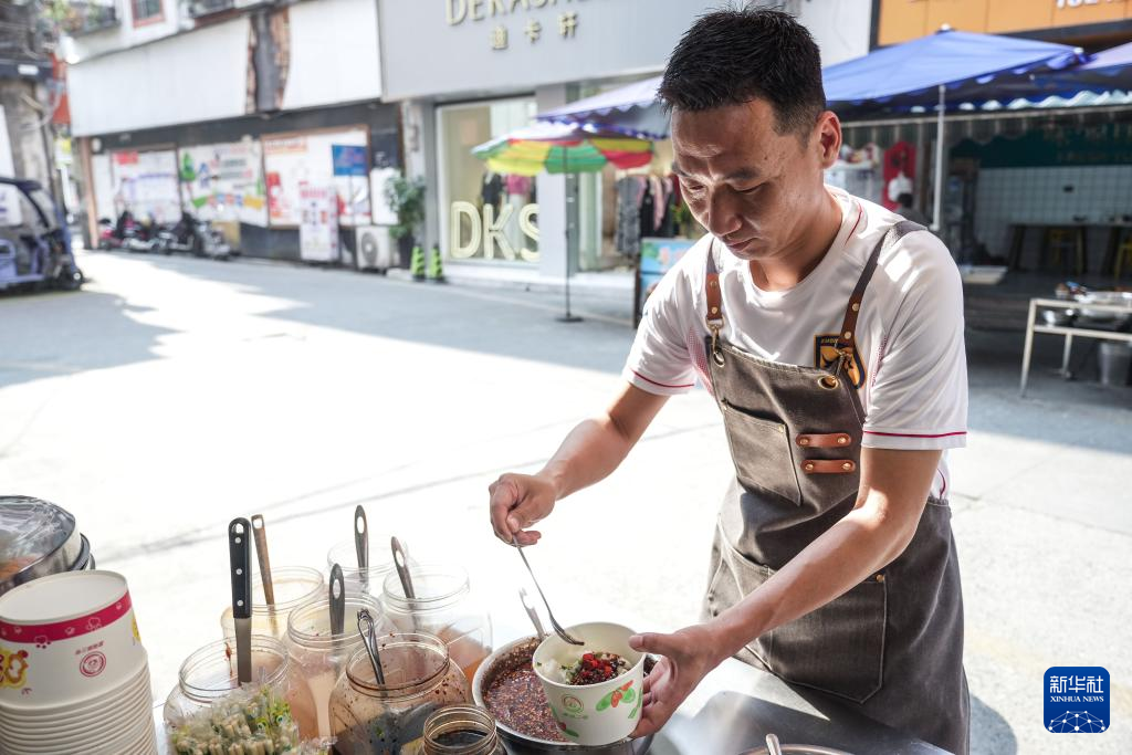 董永恒在榕江县亲戚家的卷粉店为客人打包卷粉(3月27日摄)。新华社发(王炳真 摄)