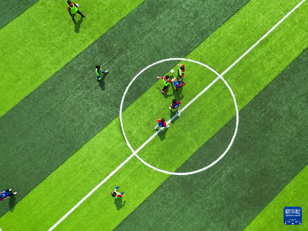 榕江县的孩子们在董永恒的指导下进行足球比赛训练(3月23日摄,无人机照片)。新华社记者 杨文斌 摄
