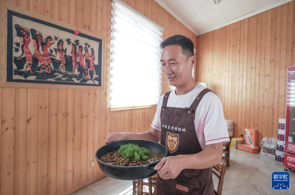 在榕江“村超”美食根据地餐馆,董永恒为顾客端上“村超”特色菜品——牛瘪(3月27日摄)。新华社发(王炳真 摄)