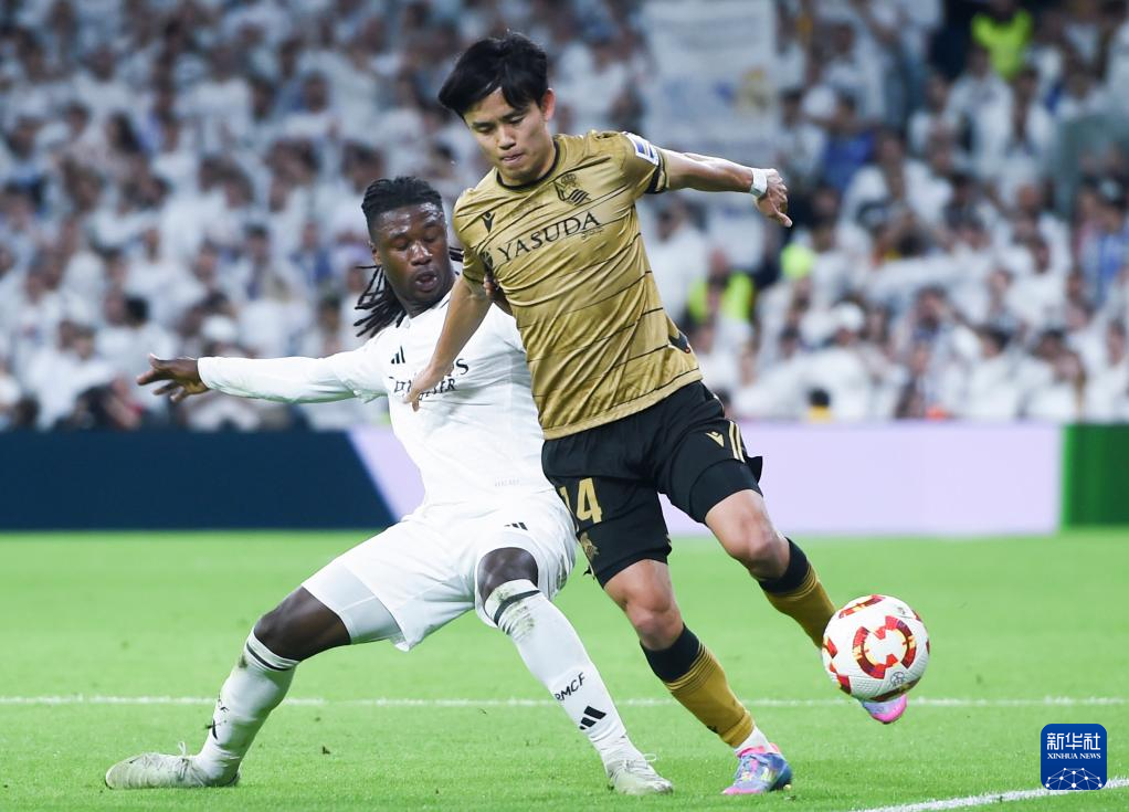 4月1日,皇家马德里队球员卡马文加(左)和皇家社会队球员久保建英在比赛中拼抢。