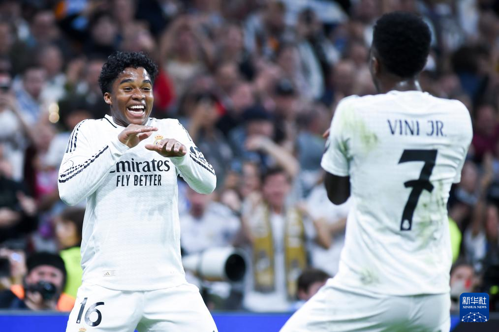 4月1日,皇家马德里队球员恩德里克(左)和维尼修斯在比赛中庆祝进球。