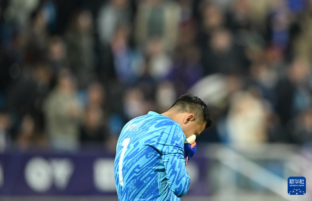 4月2日,北京国安队守门员韩佳奇在球队失球后。