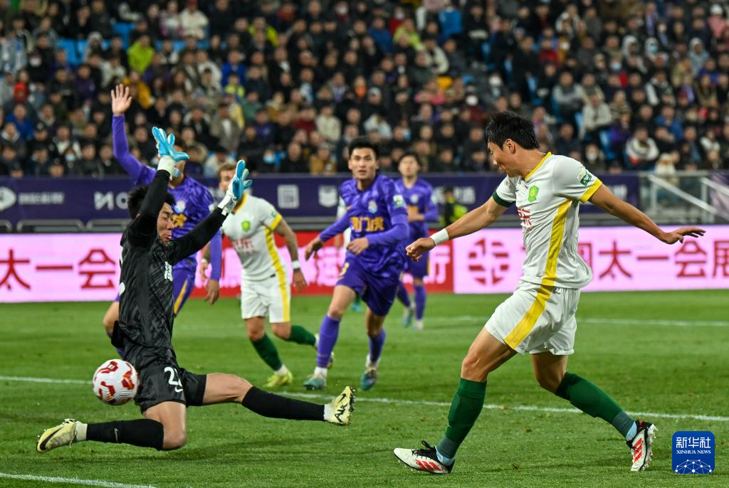 4月2日,北京国安队球员李磊(右)在比赛中射门得分。