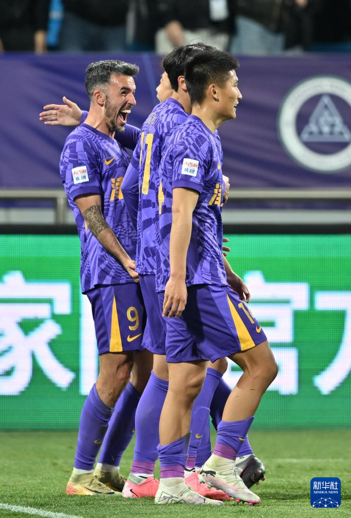 4月2日,天津津门虎队球员庆祝进球。
