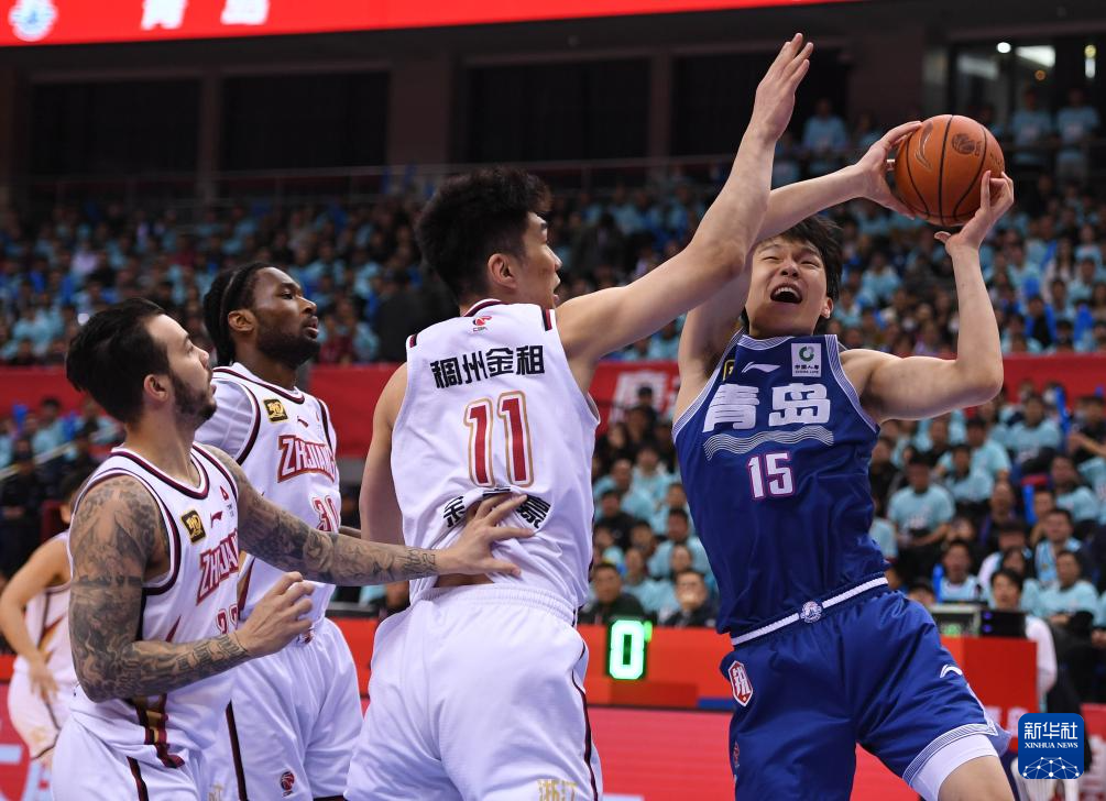 4月4日,青岛国信制药队球员王睿泽(中)在比赛中突破。