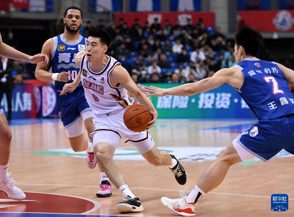 4月10日,浙江稠州金租队球员程帅澎(中)在比赛中持球进攻。
