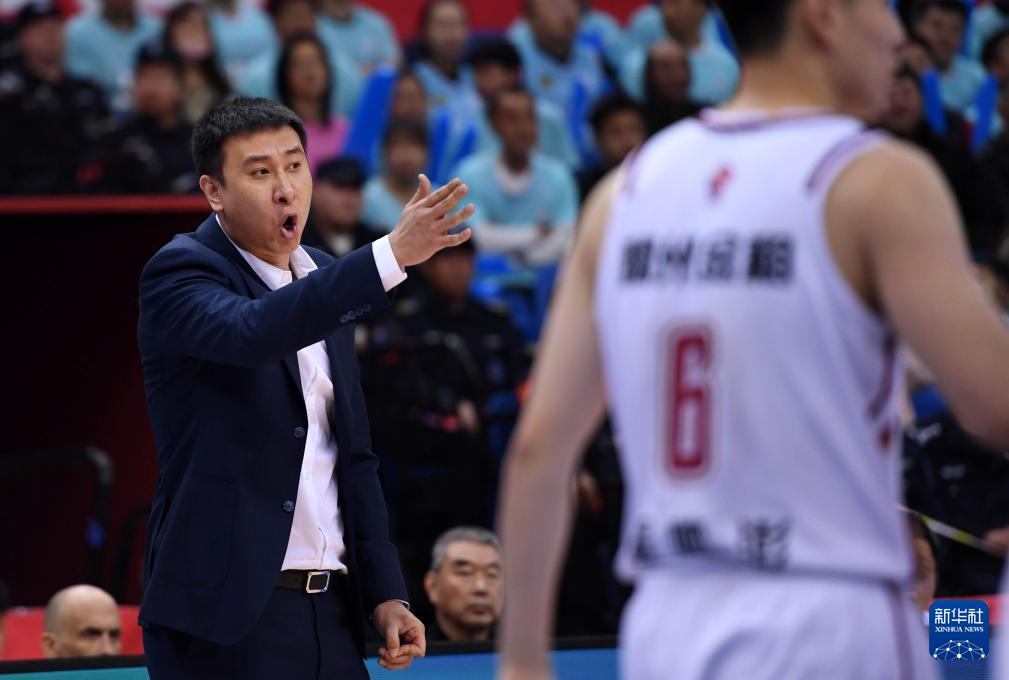 4月10日,浙江稠州金租队主教练鞠鹏(左)在场边指导球员。