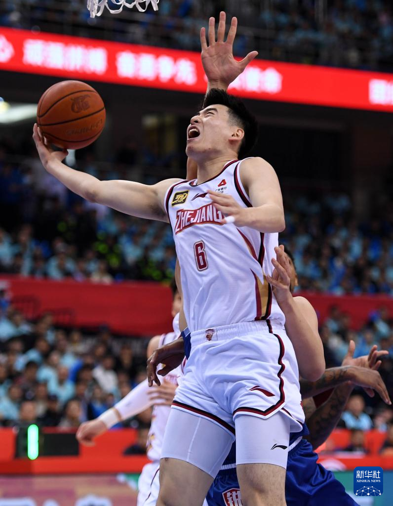 4月10日,浙江稠州金租队球员程帅澎(前)在比赛中上篮。