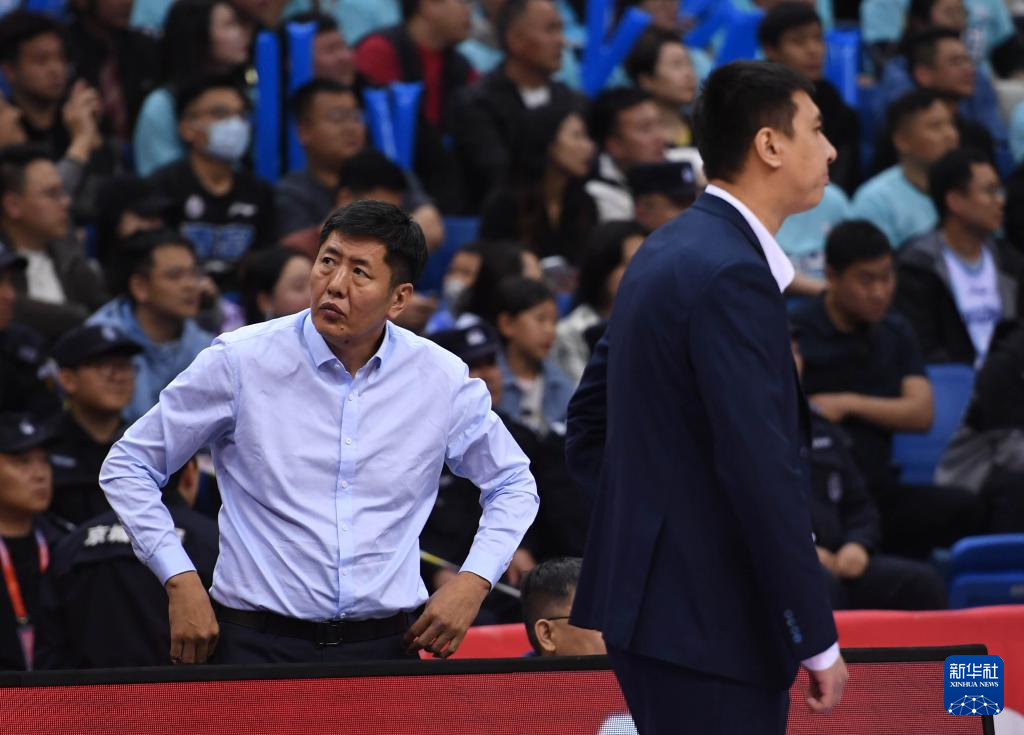 4月10日,浙江稠州金租队主教练鞠鹏与顾问丁伟(左)在场边。