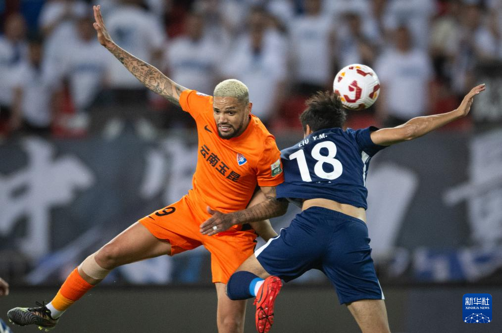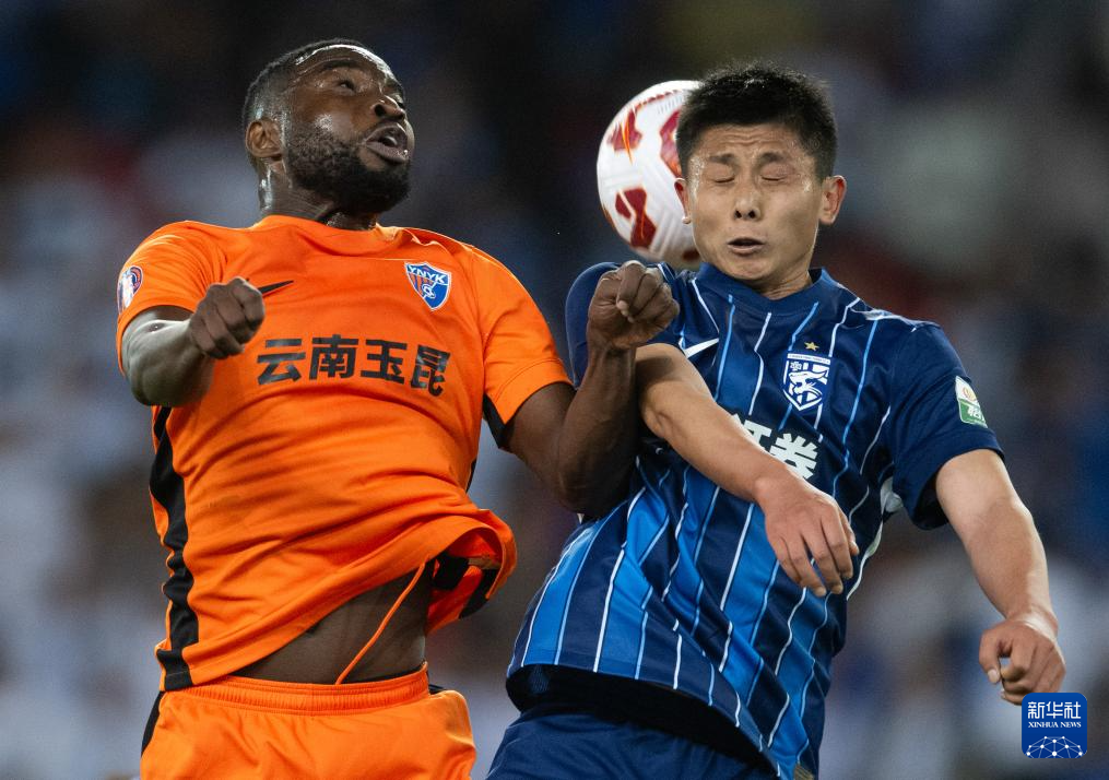 4月12日,云南玉昆队球员奥斯卡(左)与武汉三镇队球员郑凯木争顶。