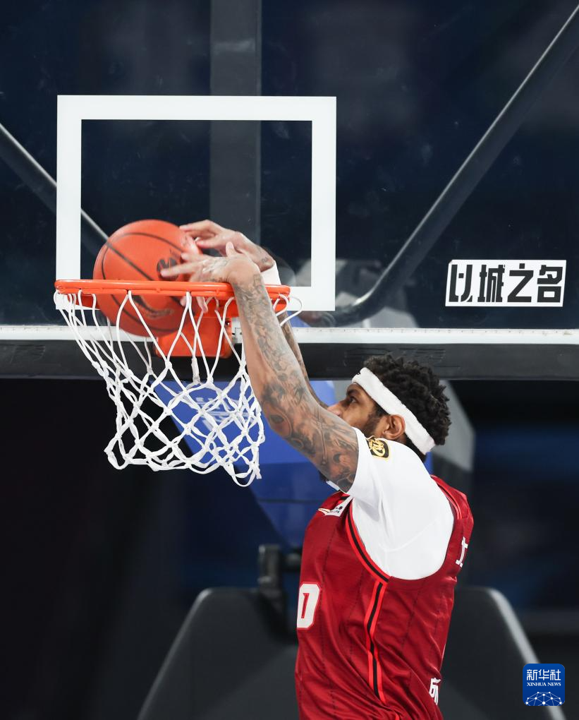 4月14日,北京北汽队球员所罗门在比赛中扣篮。