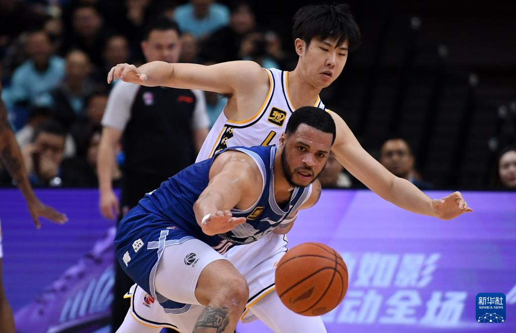 4月18日,青岛国信制药队球员韦瑟斯庞(前)与浙江方兴渡队球员赵嘉仁拼抢。