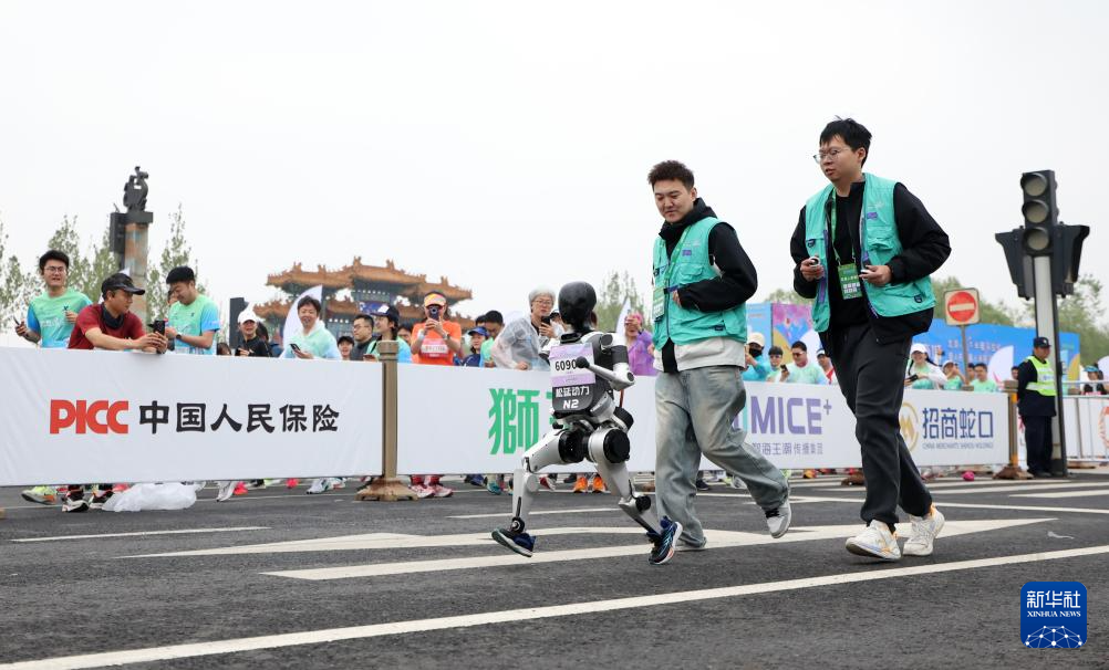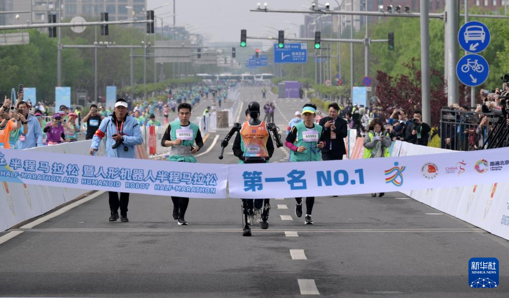 4月19日,参赛选手与人形机器人共同冲出起跑线。