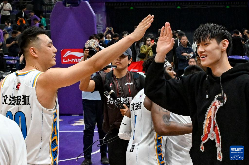 4月19日,北京北汽队球员翟晓川(左)在获胜后与因伤未上场的队友曾凡博(右)庆祝。