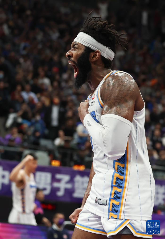 4月19日,北京北汽队球员杰曼庆祝比赛胜利。