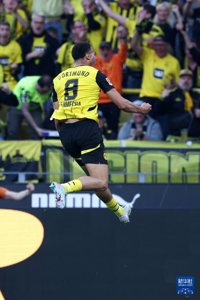 4月20日,多特蒙德队球员恩梅查在进球后庆祝。