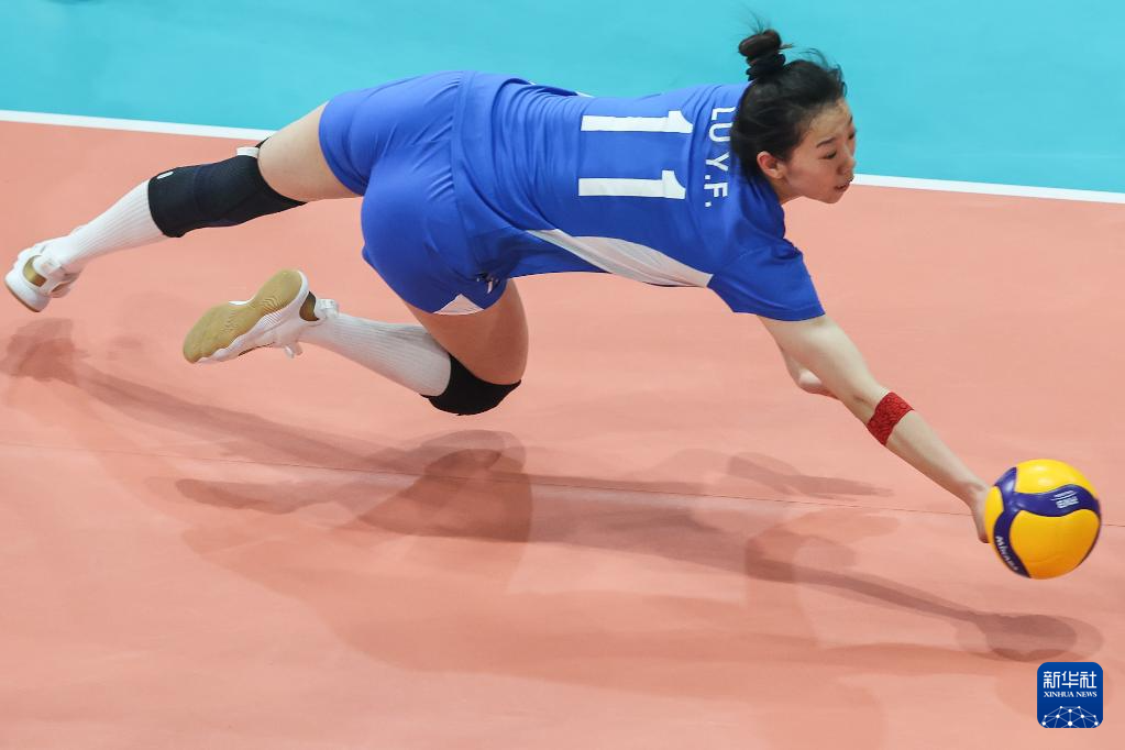 4月21日,北汽女排俱乐部队球员逯雨菲在比赛中救球。