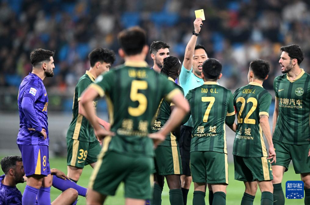 4月20日,主裁判王迪(右四)向浙江俱乐部绿城队球员陶强龙(右三)出示黄牌。