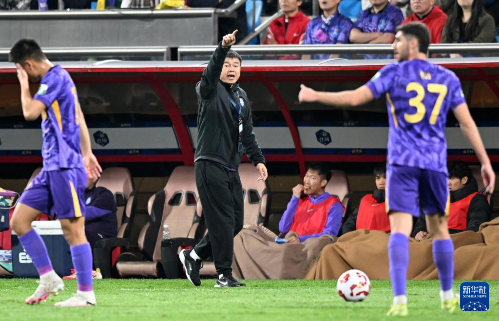 4月20日,天津津门虎队主教练于根伟(中)在场边指导球员。