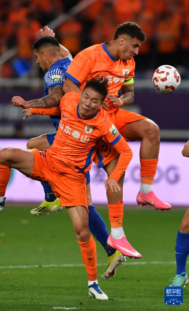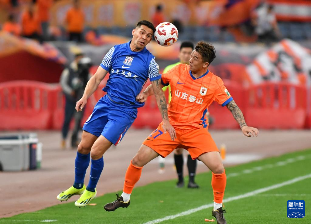 4月26日,上海申花队球员安德烈·路易斯(左)与山东泰山队球员石柯争顶。