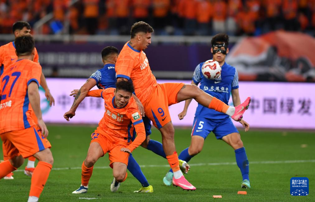 4月26日,山东泰山队球员克雷桑(上右)在比赛中。