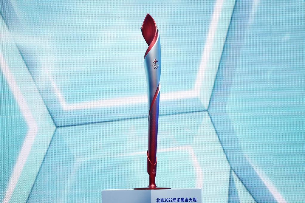 在北京冬奥会倒计时一周年活动上拍摄的北京2022年冬奥会火炬。新华社记者鞠焕宗摄
