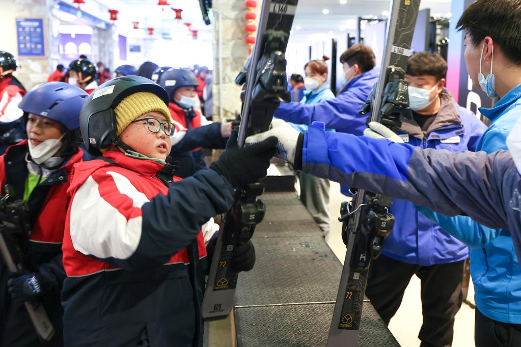 2月27日,在吉林市万科松花湖度假区,前来参加滑雪体育课的吉化第九中学学生在雪具大厅内领取雪具装备。新华社记者许畅摄