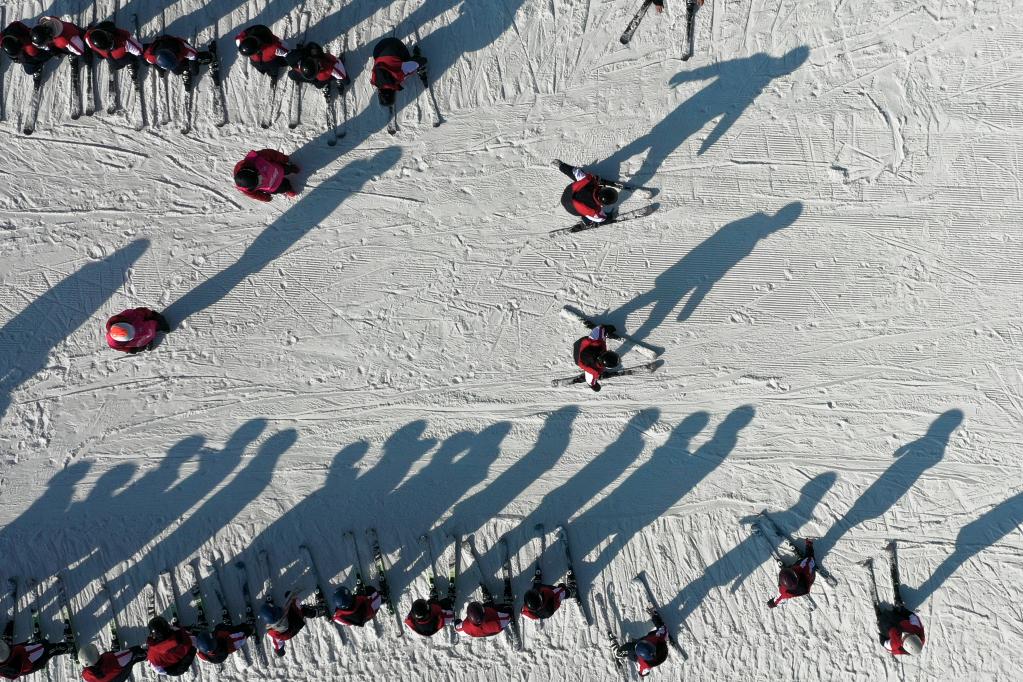 在吉林市万科松花湖度假区,吉化第九中学学生在滑雪体育课上练习滑雪(无人机照片)。新华社记者许畅摄