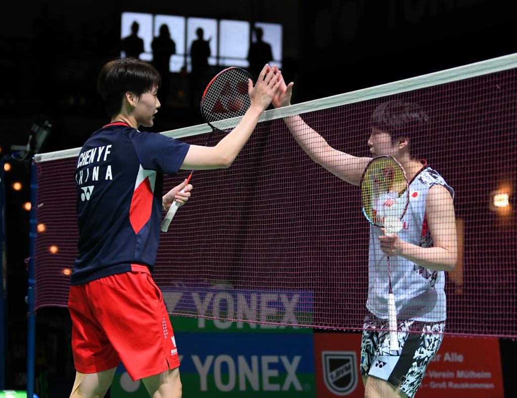3月11日,陈雨菲(左)在2023年德国羽毛球公开赛女子单打半决赛后与山口茜击掌致意。新华社记者任鹏飞摄