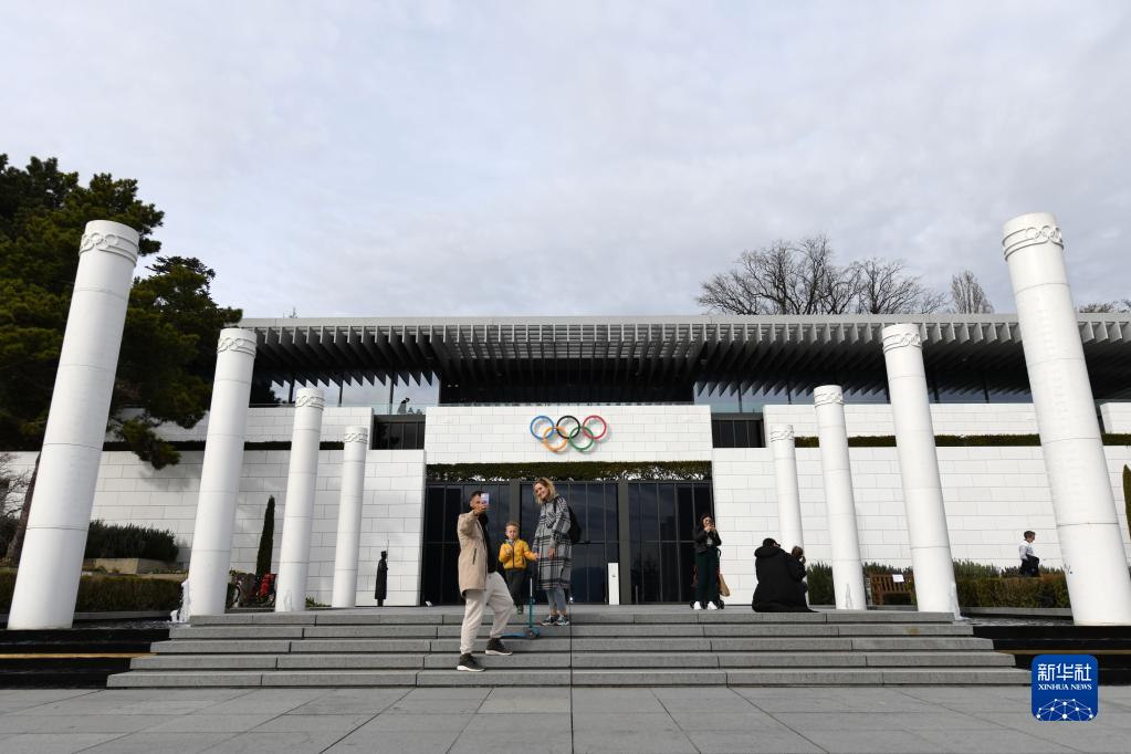 3月21日,人们在国际奥林匹克博物馆门口合影留念。新华社记者 连漪 摄