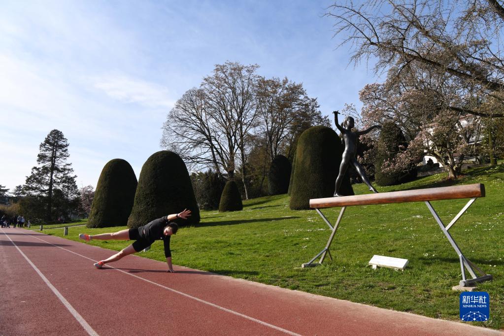3月22日,一名女子在瑞士洛桑奥林匹克公园运动健身。新华社记者 连漪 摄