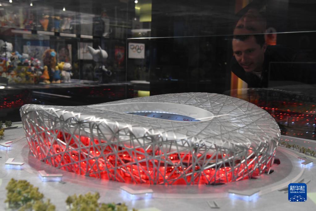 3月21日,一名男子在国际奥林匹克博物馆内参观中国国家体育场“鸟巢”的模型。新华社记者 连漪 摄