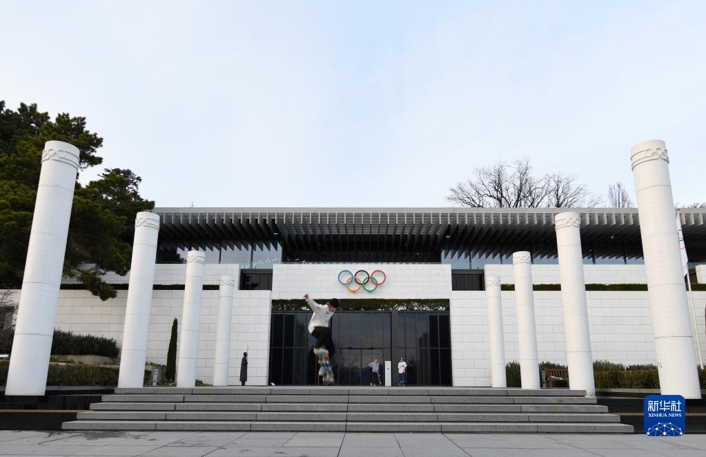3月22日,滑板爱好者在国际奥林匹克博物馆门前玩滑板。新华社记者 连漪 摄