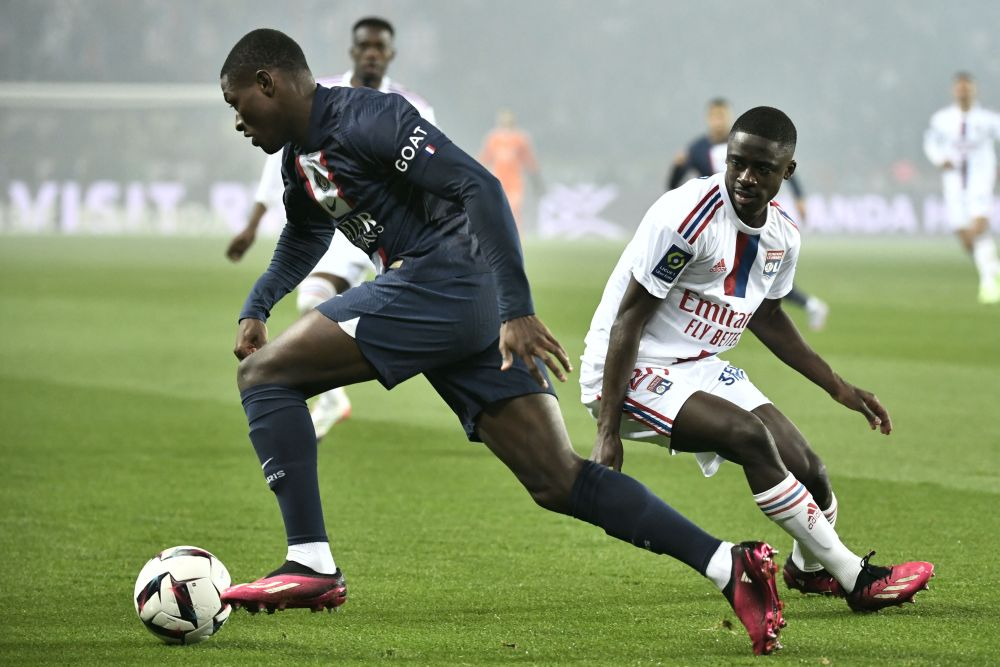 巴黎圣日耳曼队与里昂队球员拼抢。新华社/法新