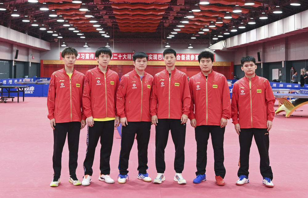 4月3日,参加德班世乒赛的中国男队球员林高远、王楚钦、樊振东、马龙、梁靖崑、林诗栋(从左至右)在新闻发布会后合影。新华社记者 陶希夷 摄