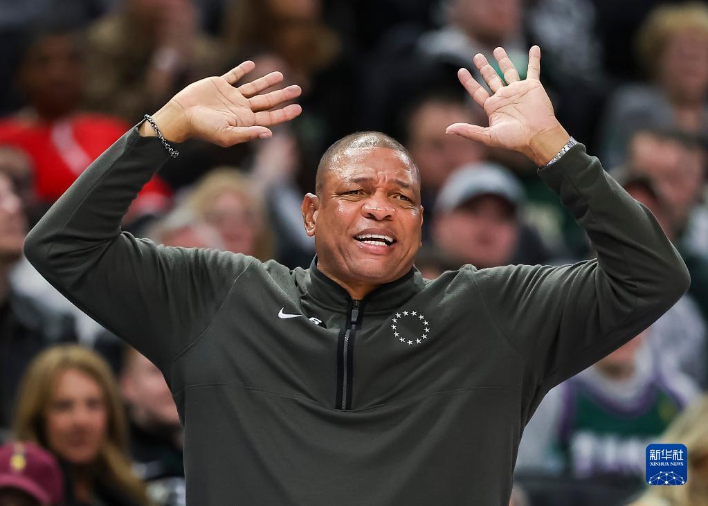 4月2日,76人队主教练里弗斯在比赛中质疑裁判。新华社发(乔尔·莱纳摄)