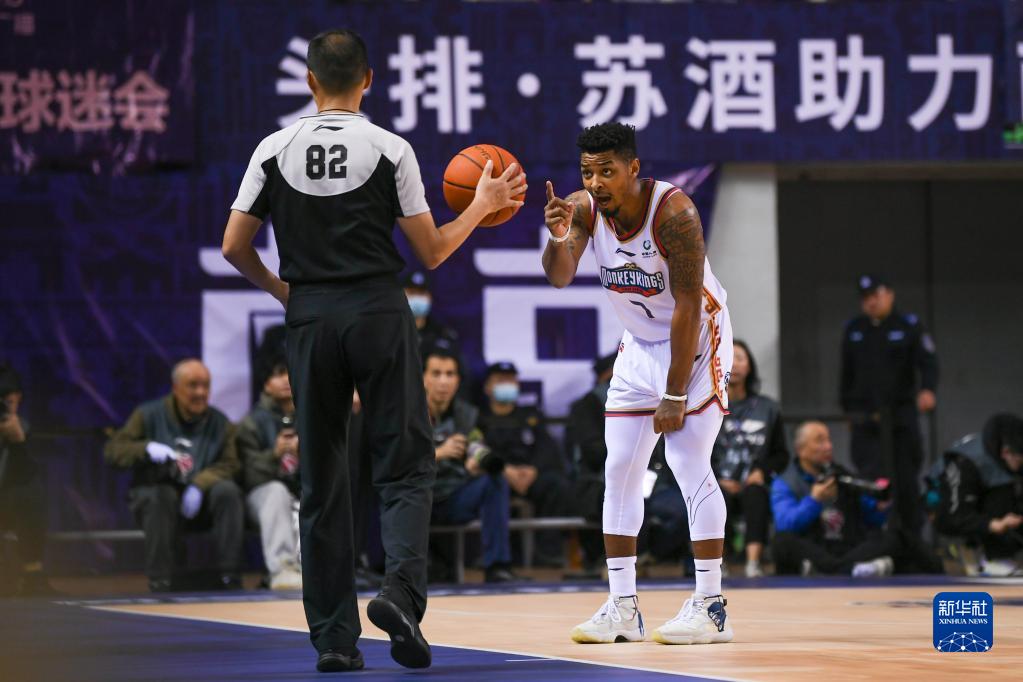 4月3日,南京同曦宙光队球员皮特森(右)在比赛中与裁判理论。新华社记者 李博 摄