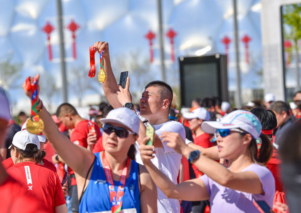 4月16日,北京半程马拉松参赛选手在完赛后拍摄完赛奖牌。新华社记者陈钟昊摄