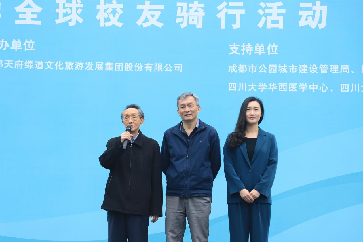 图为王庭科(右一)、孙小松(中)、孙可心(左一)在四川大学全球校友骑行活动现场。受访者供图